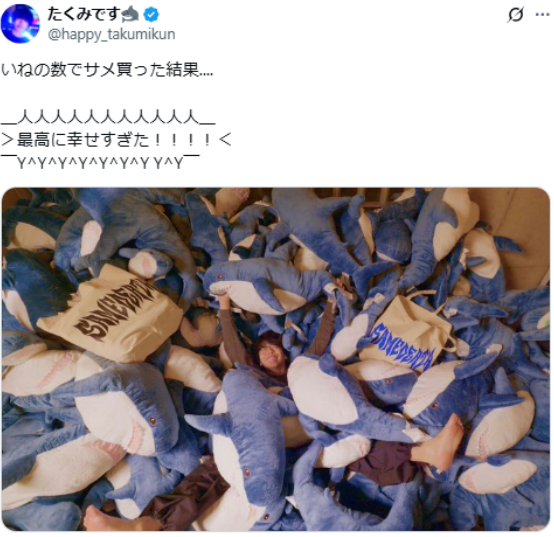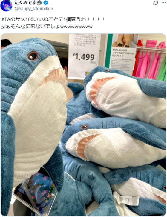 近日,日本一位视频创作者たくみです(@happy_takumikun)在X平台上发起“每获得100个赞,我就买一只IKEA鲨鱼”的活动。他起初轻松表示:“只是个小企划,应该不会收到太多赞吧”。