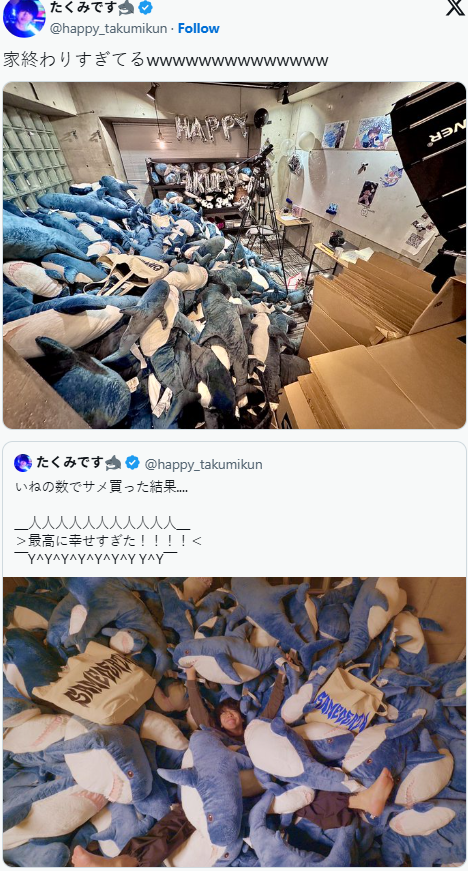 留言区一片沸腾:“偷偷拿走一只应该不会被发现吧w”、“这房间根本没有落脚的地方,笑死”、“好想跳进那堆鲨鱼里www”、“这数量简直是批发商级别”、“跌倒也不会痛,鲨鱼会全力接住你XD”。