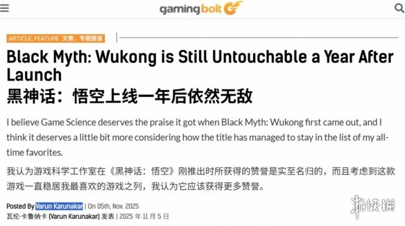 近日,国外媒体Gamingbolt再次发文赞美《 黑神话:悟空 》。编辑Varun Karunakar指出,即便该作已发售一年,其在同类游戏中仍难逢对手。