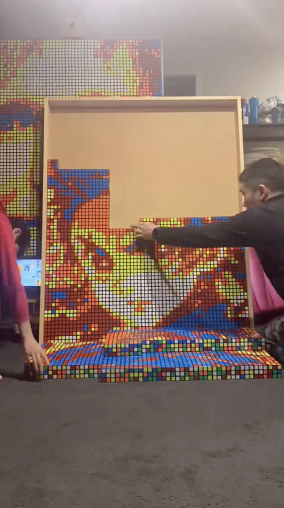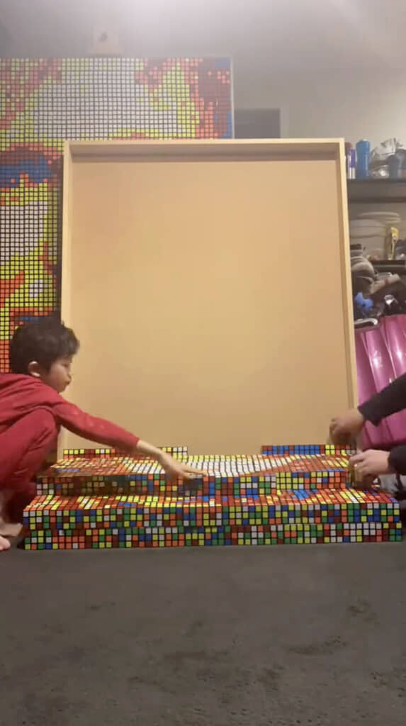 在创作过程中,父子俩先准备了超过400颗魔方,仔细地将每一颗转到预设的颜色,再逐一放入大型木框中进行排列。随着方块一层层堆叠,炭治郎严肃的表情逐渐显现为一幅巨大的像素画。尽管只运用了魔方的6种基础颜色,但最终成品却立体而逼真,效果令人赞叹。