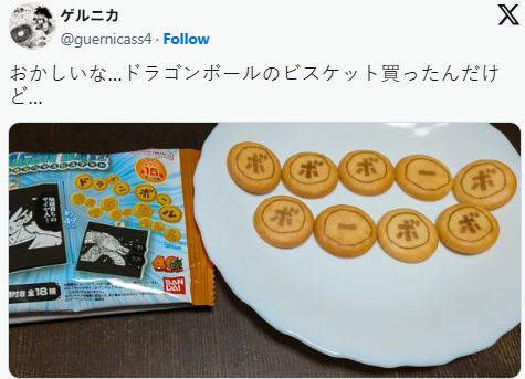 发文的网友ゲルニカ(@guernicass4)是一位资深《龙珠》粉丝。他购买的这套饼干原本印有“ド”、“ラ”、“ゴ”、“ン”、“ボ”、“ー”、“ル”等片假名字母,本该拼出“ドラゴンボール”(Dragon Ball)。然而当他将字母逐一排列在盘子上后,拼出的竟不是《龙珠》,而是传奇搞笑漫画《鼻毛真拳》(ボボボーボ・ボーボボ)!这盘“意外诞生的《鼻毛真拳》饼干”让众多网友捧腹不已。