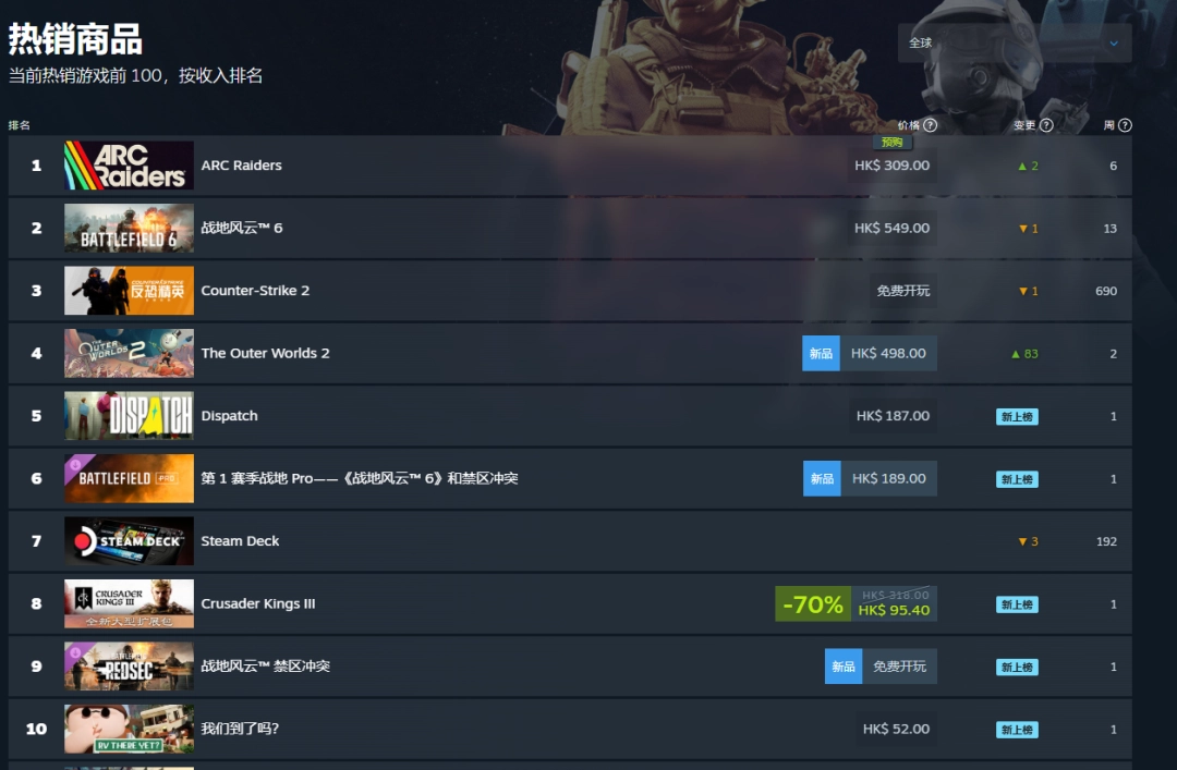 截至发稿前,该作已登顶Steam全球热销榜,超越《天外世界2》《战地6》等新作及《CS2》等长期霸榜作品;在国区热销榜(非免费游戏)中位列第六,市场表现强劲。