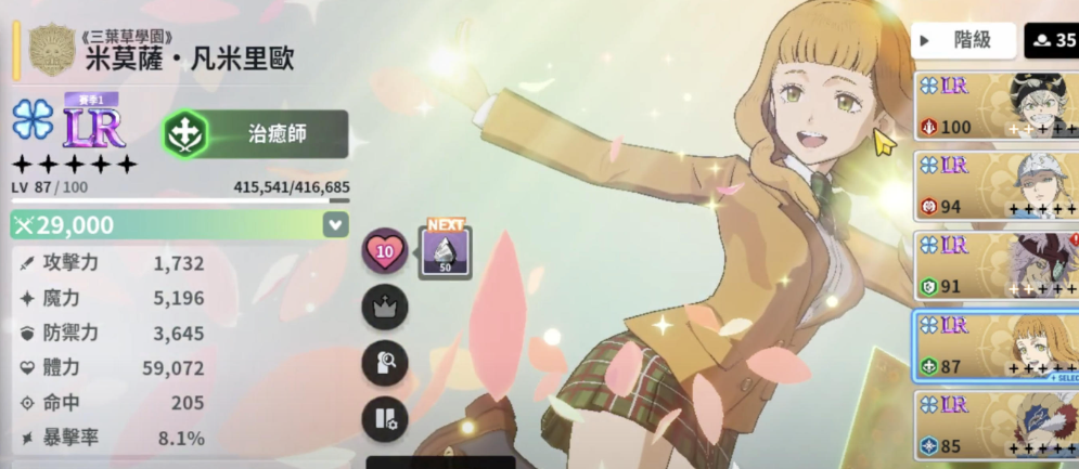 黑色四叶草魔法帝之道米莫萨怎么样?在黑色四叶草这款游戏里面,大家如果想要用治愈定位的角色,那么本期为大家推荐的这个治愈角色是大家一定要用到的,而且她在本身的品质上面也达到了SSR的品质,黑色四叶草魔法帝之道米莫萨怎么样就是本期主题,游戏当中的米莫萨是一个出身高贵的少女,并且个人魅力也是很强的,在原版当中莫萨就是一个人气非常高的角色,在游戏制作当中,她的技能其实就是主要是放在续航定位上面的。