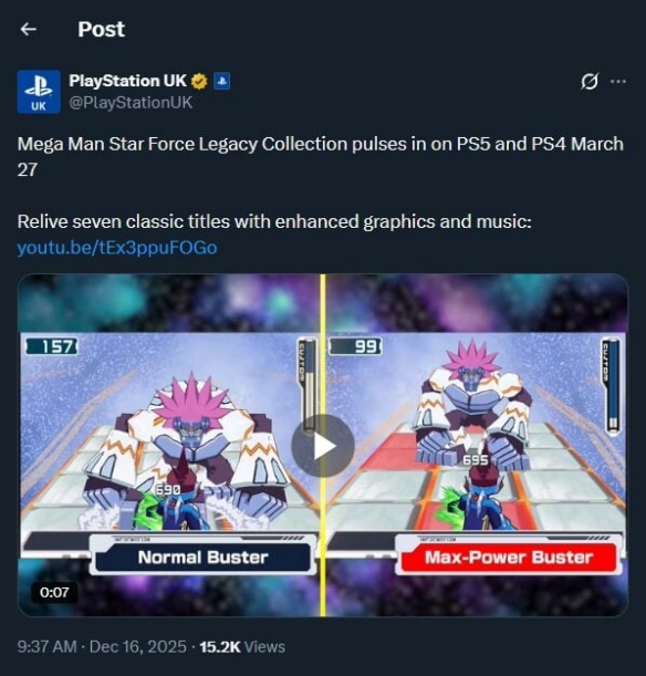 今日,卡普空旗下经典系列新作《流星洛克人 完美合集》的发售信息疑似泄露。PlayStation英国官方发布的一条推文显示,本作预计将于2026年3月27日发售。该推文随后被迅速删除,但外媒gematsu对其内容进行了截图保存。