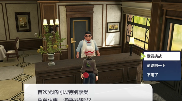 进入餐馆与NPC对话,在此处需要接受免单挑战。