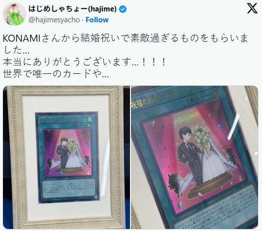 拥有1600万订阅的日本知名YouTuber——以生活实验、灵异探索、游戏实况闻名的Hajime社长,近日分享自己收到了来自KONAMI赠送的“世界唯一《游戏王》卡片”作为结婚贺礼。这份特殊礼遇与喜事,收获了网友的广泛赞赏与祝福。