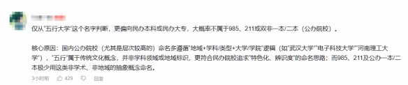 在评论区,一些玩家认真分析了“五行大学”这一名字,猜测这所大学更像是民办本科或民办大专,而不是985、211等重点高校,甚至提到它大概不属于公办院校。