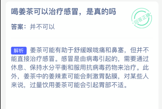 以上就是喝姜茶可以治疗感冒,是真的吗,支付宝蚂蚁庄园2025年10月13日答案最新,更多精彩内容,请点击关注39闲玩网更新 !