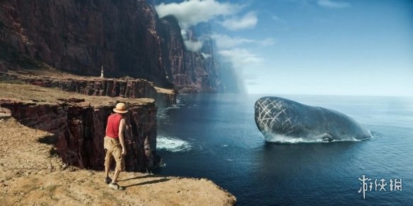 这张关键视觉图首次完整展示了真人剧中拉布的具体形象——该角色曾在2025年8月的预告片中出现。当时的画面仅呈现了黄金梅利号驶入鲸鱼口腔的一幕,未能展现其全貌;而此次释出的图片则从正面清晰呈现了鲸鱼的整体外观,包括它身上多处历经岁月留下的伤痕。