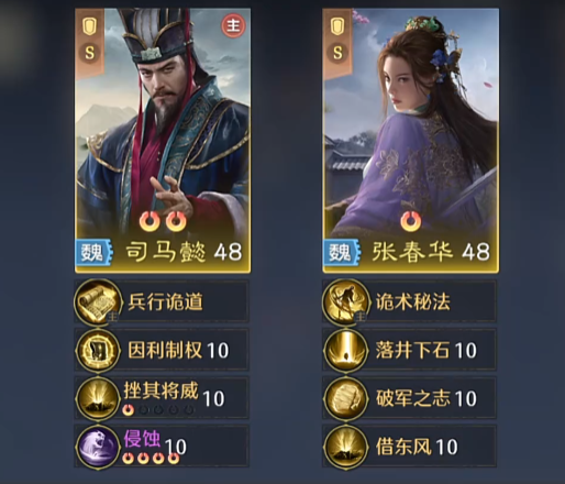 虽然在这里带来的是法术输出的一个提升能力,但是后期他在他的挫其将威之后还可以提升对于对面将领的一个削弱效果,所以在这里的司马懿强度上面来说的话,他也是属于可以给曹操带来加成的一个角色,张春华可以带的则是借尸还魂以及君心我心,在这里战斗当中,这两个技能可以增加张春华各项属性效果,可以带来的中毒持续输出能力也会更强,而且可以在层数叠加足够的时候也为队伍带来足够的输出提升。
