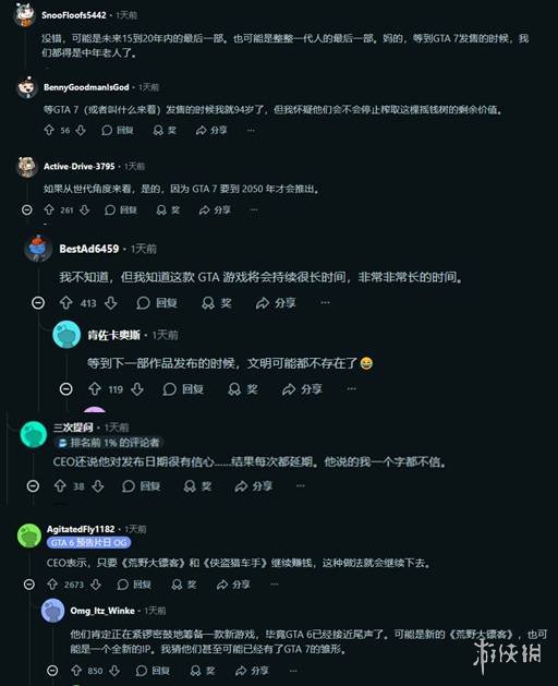 尽管意见分歧,但多数玩家仍坚信《GTA》系列不会就此止步。只不过,等待下一部作品的时间,可能会比想象中更漫长:“这不会是终点,但《GTA7》恐怕要等上十年,甚至更久。”“我敢肯定《GTA6》的生命周期会异常长,可能比前作还夸张。”“等到下一作公布时,文明是不是还在都难说。”“《GTA7》发售那天,我们这代玩家恐怕都已经中年了。”