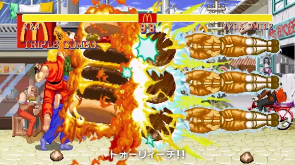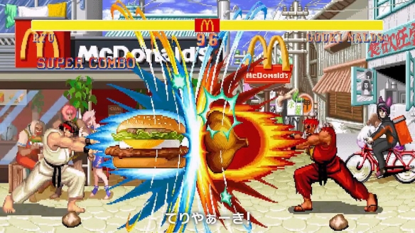 宣传片采用90年代街机游戏的视觉风格,通过精细的像素动画呈现了《街头霸王》中的经典角色与麦当劳明星产品的创意互动。这种将格斗招式与快餐产品巧妙结合的表现手法,既保留了游戏原作的热血氛围,又增添了独特的幽默趣味。