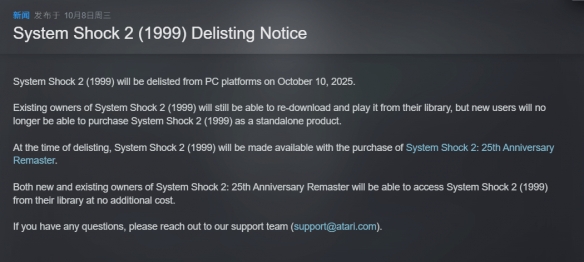 近日,官方宣布,1999年发售的科幻恐怖游戏《网络奇兵2》将于10月10日起从Steam平台下架。已拥有游戏的玩家仍可继续从游戏库中下载并游玩,但新玩家将无法再单独购买该版本。