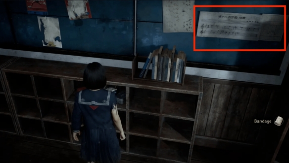 在深水雏子探索戎菅丘中学时,玩家会听到有人在打开通往二楼的楼梯门前敲击琴弦的声音。走进二楼的某个房间后,你会发现一张乐谱,上面画着原版《寂静岭》主题曲的开场音符,向经典游戏致敬。