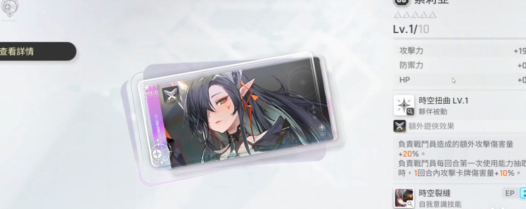 第二个是索利亚的时空扭曲,这个专武还是相当有意思的,属于游侠专武,该角色主要负责战斗员造成额外伤害增加20%,比较契合当前版本的主C角色,常常适合和雨果搭配使用,在整体的战斗方面还是较为突出的,并且在一回合内攻击 卡牌 伤害量再加10%,还是能够打出不错的回合成绩。