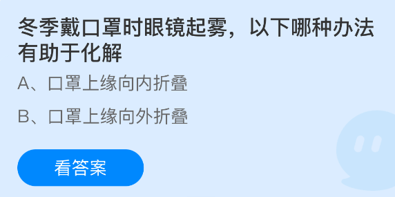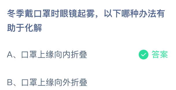 冬季戴口罩时眼镜起雾,以下哪种办法有助于化解?支付宝小鸡课堂开课啦!每天花一分钟答题赚饲料,喂喂小鸡就能贡献爱心啦!轻松又意义十足!2026年2月8日蚂蚁庄园的小鸡课堂题目正确答案是【口罩上缘向内折叠】,冬季戴口罩时,眼镜起雾是因为呼出的暖湿气流从口罩上缘缝隙逸出,遇到冷的镜片凝结成雾。将口罩上缘向内折叠一小条,可以增加口罩上缘的密合度,减少气体向上泄漏,从而有效防止镜片起雾。