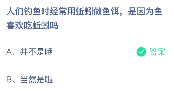 人们钓鱼时经 常用 蚯蚓做鱼饵,是因为鱼喜欢吃蚯蚓吗?支付宝小鸡课堂开课啦!每天花一分钟答题赚饲料,喂喂小鸡就能贡献爱心啦!轻松又意义十足!2025年12月16日蚂蚁庄园的小鸡课堂题目正确答案是【并不是哦】,吸引鱼类的并不是因为蚯蚓的味道,而是其基因中存在对蠕虫状物体的天然反应。