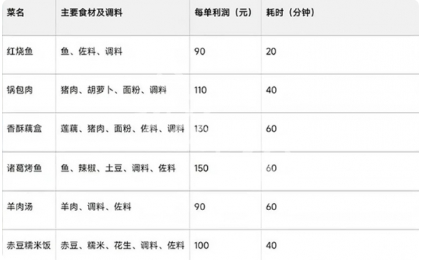 2、诸葛烤鱼的每单利润为150,耗时为60分钟,每单比同样耗时的香酥藕盒要高出20。