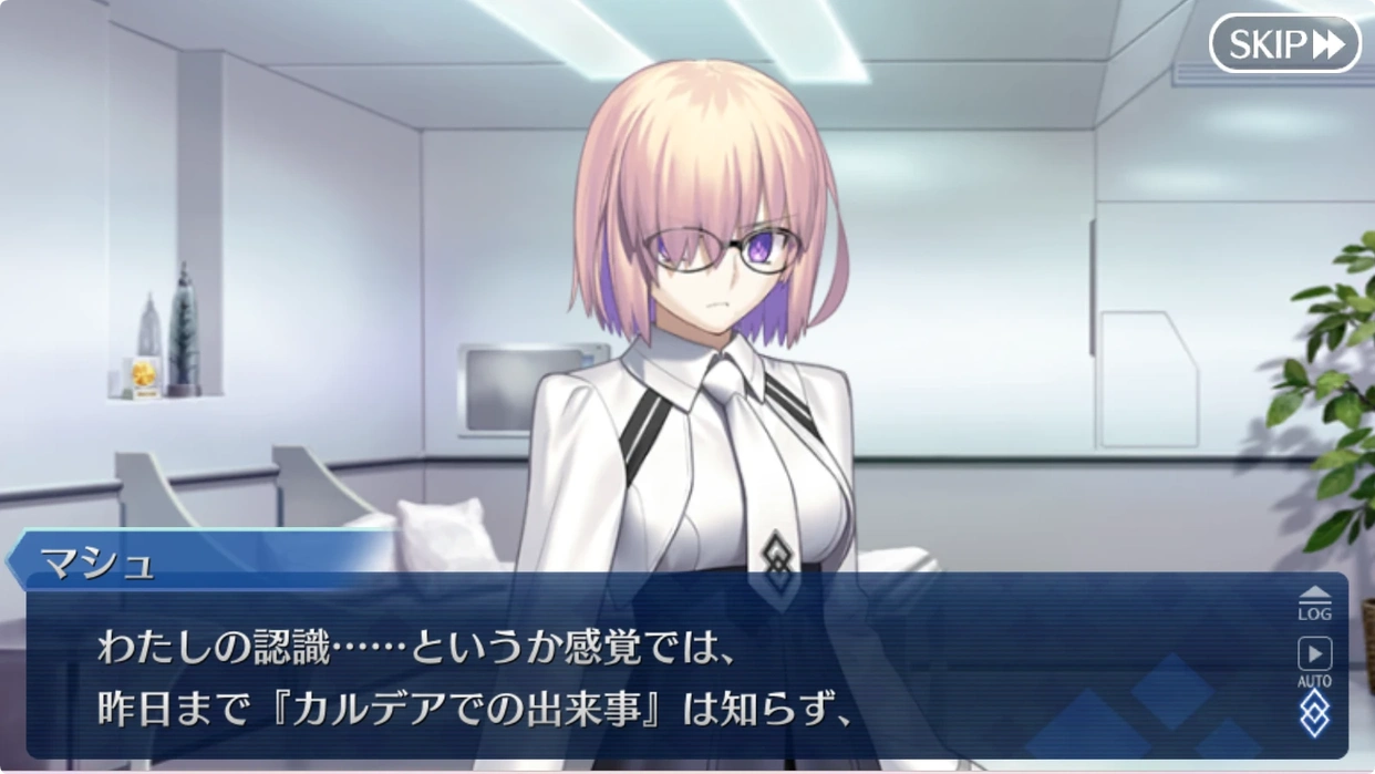 剧情时间是介于2019年12月31日到2020年的1月1日之间,开头是咕哒在迦勒底的房间新来,然后玛修到访,说明了自己有过一段失忆之后回归正常生活的经历,然后今天醒来发现回归后的记忆消失了,反而衔接上了过往那段本来应该被剪掉的记忆。