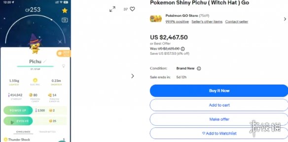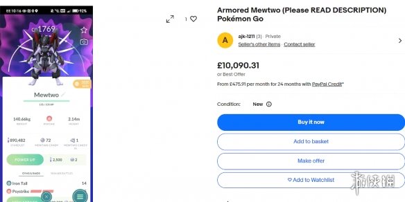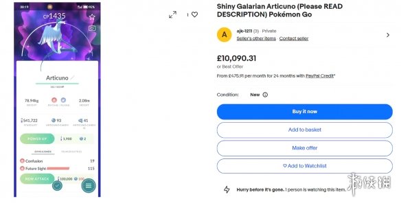 这只超稀有变种近日现身英国eBay平台,标价10,090.31英镑(约13,250美元)。同一卖家还以相同价格出售装甲超梦——该形态仅在2019年和2020年两次团体战限时登场。商品描述称卖家将通过伪造GPS定位"抵达"买家所在位置进行常规交易,同时承诺预先提升两只宝可梦的CP值。