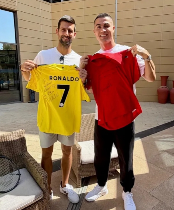 作为各自领域的标志性人物,德约科维奇手握24座大满贯冠军,C罗则拥有5座金球奖及多项欧冠荣誉,两位运动员都以极致的自律和持久的巅峰状态著称。此次会面中,德约科维奇向C罗赠送了个人签名战袍,球衣上特别标注了对这位足球传奇的敬意;C罗则回赠了附带定制化To签的经典足球球衣,完成了这场双向奔赴的体育情谊。