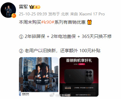 今日,雷军在微博发文宣布,本周末购买K90系列将享有首销优惠,包括:2年碎屏保、2年电池盖保、365天“只换不修”服务,老用户以旧换新还可获得额外100元补贴。