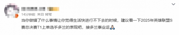 与此同时,网友们纷纷调侃要接一下上单选手Doran(多兰)的“事业运”。自从加入T1以来,多兰一直备受质疑,许多粉丝将他与前T1上单Zeus(宙斯)进行对比。多兰在T1夺得冠军的表现,也让不少人认为这完全是“事业运太好”。