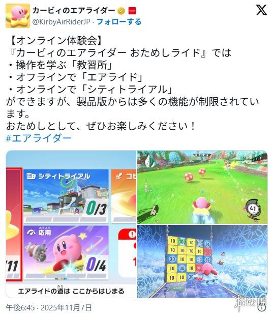 《卡比的驭天飞行者》计划于11月20日发售,发售前的体验活动“试乘体验”自11月8日起至11月17日限时开放。活动期间,每天指定6小时内可享受在线多人游戏。同时,还设有可随时游玩的“训练场”,供玩家学习基本操作。