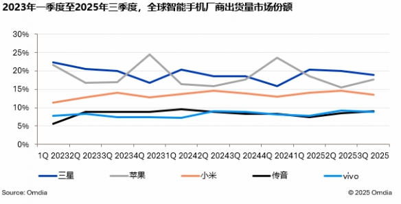 尽管与前两名存在差距,小米稳居全球第三,第三季度出货量为4340万台,占市场份额的14%。传音和vivo分别以2860万台和2850万台的出货量位居第四和第五,市场份额均为9%。