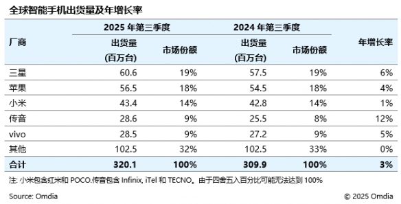 根据Omdia(原Canalys)最新数据显示,2025年第三季度全球智能手机市场出货量达到3.201亿台,同比增长3%。其中,三星以6060万台的出货量和19%的市场份额继续稳居榜首,同比增长6%。