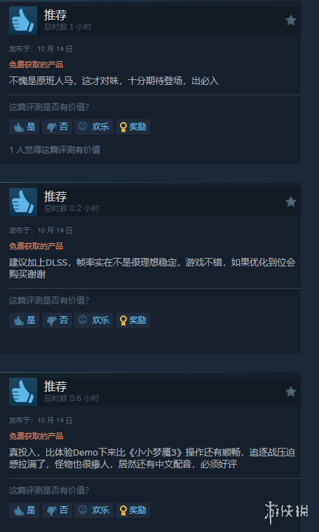 根据玩家评价反馈,多数玩家对游戏中氛围营造、怪物设定、本地联机功能以及中文配音表示高度认可。不过,也有部分玩家指出试玩版存在优化不足、画面卡顿掉帧等问题。