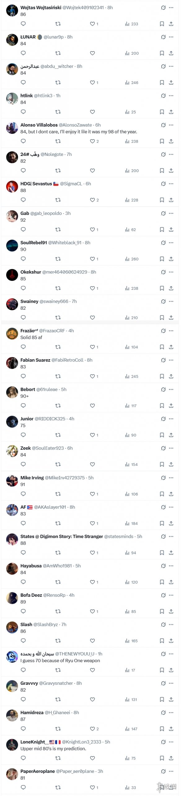 在评论区,玩家们纷纷表达了自己的看法,普遍预测这款游戏的评分将超过80分,其中多数玩家预计评分为84分,当然也有玩家给出了90分或92分的高分。显然,大多数人相信《忍者龙剑传》系列的最新作将延续前作的优良品质,并继续保持强劲表现。