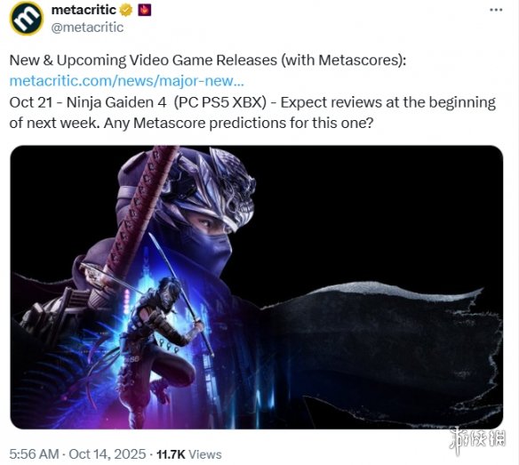 《忍者龙剑传4(NINJA GAIDEN 4)》将于10月21日正式发售,登陆Xbox、PS5、PC平台,并首发加入XGP。今日,Metacritic官方发文预热,宣布将于下周初发布相关评测,并向玩家们提问:“你们对这款游戏的评分预测是多少?”