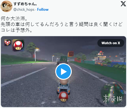 推主すずめちゃん。(@chick_hops)在《马里奥赛车世界》的大地图中兜风时,竟遇到了现实中常见的交通状况——堵车。虽然游戏世界不必遵守交通规则,可以随意切换车道驶离,但第一次在“马车”游戏中看到堵车,确实相当稀奇。也因此,推主切换车道上前查看,究竟是谁阻碍了交通。