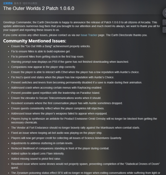 黑曜石娱乐为《天外世界2》发布了1.0.6.0版本更新,并公布了完整的补丁说明。 让我们一起来看看这次更新带来了哪些内容。这次更新包含了超过250项的调整、修复和更改。 可以算是《天外世界2》的一次重大更新。