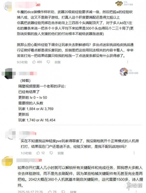 在近日发布的官方公告里,开发团队作出了三项优化承诺:对局结算时获得的经验提升10%、每日奖励增加40%、武器前20级配件的解锁门槛降低。这些摆在明面上的福利举措,赢得了玩家的一致好评。然而,当玩家们在实际体验后,社区里有人发现官方同时大幅降低了门户模式中击败AI所获得的经验值,而这一关键的变动在更新说明中却只字未提。