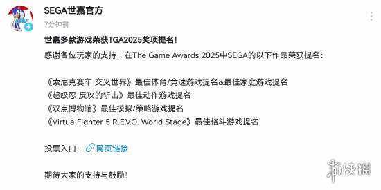 在近日揭晓的TGA2025游戏提名榜单里,世嘉旗下有多款游戏成功入选。今日,世嘉官方特意发文,向一直以来给予支持的玩家们表达感谢。
