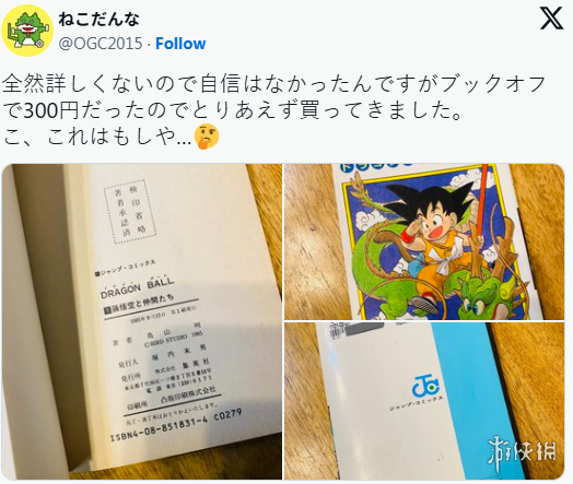 近日,日本有网友在二手连锁店Book OFF发现一本仅售300日元的《龙珠》单行本第一集,便果断买下。没想到翻到书尾时,竟发现这是首刷初版,该网友将此事分享至社交平台X后,迅速引发热议。