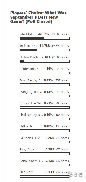 官方公布的数据显示,9月的竞争异常激烈,而《寂静岭f》凭借绝对优势胜出,共收获13,683张选票,得票率高达49.62%。经典JRPG游戏《空之轨迹 the 1st》以34.78%的得票率位居次席,备受瞩目的动作游戏《空洞骑士:丝之歌》则以9.39%的得票率位列第三。其余参与评选的游戏,如《无主之地4》《消逝的光芒:困兽》以及《最终幻想战略版RE》等,得票率均未突破1%大关。