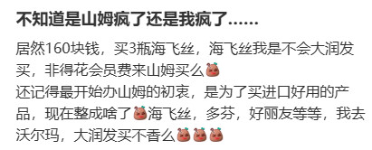 近日,一位网友在社交平台发帖,对山姆会员店售卖160元3瓶的海飞丝洗发水表示不满,认为此类商品在普通超市即可购得,无需专程前往会员制商店购买。该帖子迅速引发热议,许多会员消费者纷纷表示共鸣。