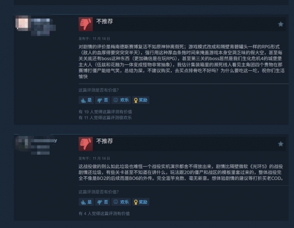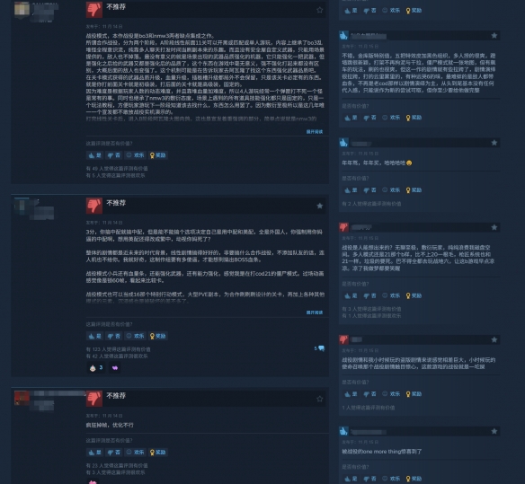 部分玩家表示,战役模式糟糕至极、无聊且敷衍,甚至直言“纯粹浪费磁盘空间”。还有玩家提到,与小时候玩过的《使命召唤》相比,新的战役剧情简直相差巨大,他们认为早期的剧情充满冲击力,而这款游戏的战役则让人失望。