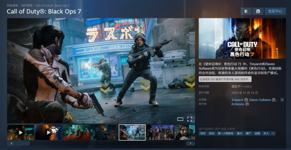《 使命召唤:黑色行动7 》已正式发售,但游戏的评价似乎不尽如人意。截稿之前,本作在Steam平台的全部评测为“褒贬不一”,在593条用户评测中,好评率仅为44%。