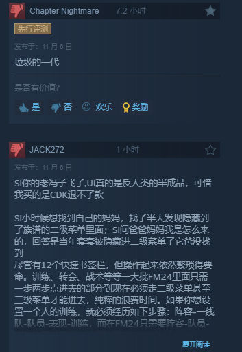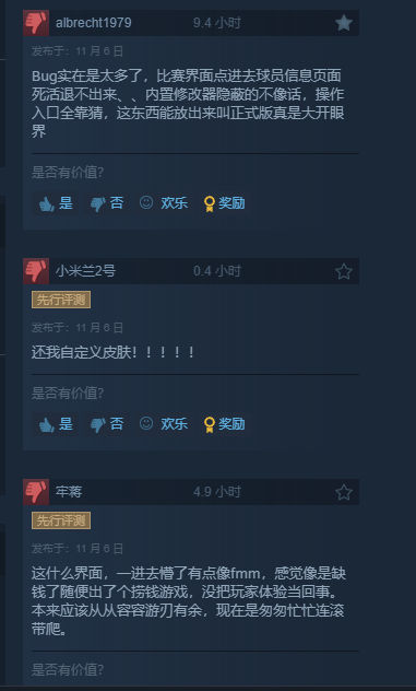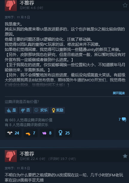 不少玩家在评价中集中批评本作用户界面(UI)设计混乱,甚至有多位自称“数千小时《足球经理》老玩家”的用户表示,在新版UI面前感到“手足无措”,操作逻辑与以往作品差异巨大。此外,游戏也被指存在大量影响体验的Bug,例如在比赛界面中点击查看球员信息后无法退出、内置修改器功能隐藏过深、操作入口不直观等问题,进一步加剧了玩家的不满情绪。