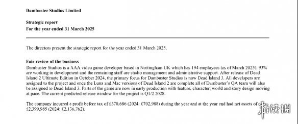 Dambuster Studios公布的财报信息表明,自2024年10月《死亡岛2》终极版正式推出之后,该工作室便已把主要的工作重心全方位地转移到了《死亡岛3》的开发工作上。