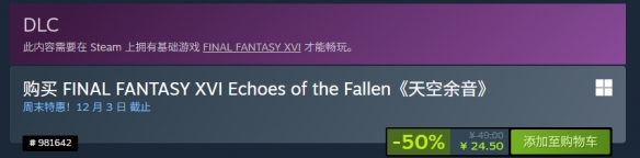 此外,《最终幻想16》的两款DLC——“天空余音”和“沧海恸哭”也在Steam迎来了新史低价促销,优惠后售价分别为24.5元和49元。值得注意的是,完整版游戏已包含这两款DLC,如果想要完整的游戏体验,建议购买完整版。