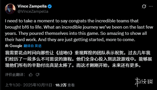 这一刻对《战地》团队来说意义非凡。Vince Zampella借此机会感谢了过去几年投入《战地6》开发的众多开发者。从字里行间可以看出,这款游戏的诞生并不容易。自《战地2042》发布以来,系列作品需要重新赢回玩家的信任,而《战地6》似乎已经做到了这一点。