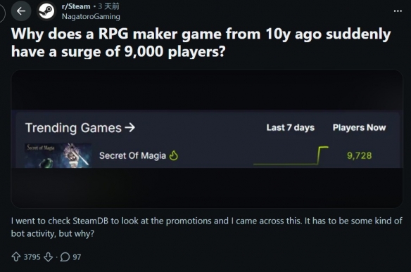 若某款游戏突然爆红,照理说社群应该会出现讨论或相关内容,但实际搜寻过去几天完全没有动静,死寂的 Steam 讨论区最新一篇文章相隔前篇已经超过半年,玩家疑问“为什么玩家数突然暴增?”大家都摸不着头绪。