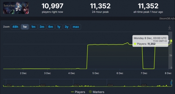 长期以来游戏线上人数极低,但在 12 月 5 日凌晨 12 点 50 分左右,玩家数量从 12 人直接飙升至 9,657 人,接下来 24 小时内几乎停在「一万人不到」的位置,波动极小。