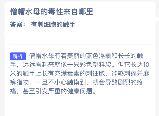 以上就是僧帽水母的毒性来自哪里?神奇海洋今天答案最新2025年12月3日分享,更多相关攻略内容,请点击关注39闲玩网更新!