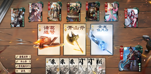 云锦袍作为典型的防御向装备,具备提升装备栏上限+2的被动效果。当玩家装备区已满五件时,若继续装备云锦袍,则会自动移除最早置入的一张装备牌,体现出“以退为进”的战略思维。该装备支持与其他类型装备共存,可构建包含物理防御、火伤减免及闪避能力的多重防护体系。同时兼容多种搭配方案,适用于主将位角色或需要长期作战的阵容配置。另一款代表性装备——开山斧,则侧重于攻击输出。其基础属性增强了攻击范围与暴击伤害,专属技能“地裂”允许使用者在打出【杀】时弃置一张手牌,使此次【杀】的伤害+1,且此增益可叠加。凭借高额爆发与群体压制能力,开山斧能够在关键时刻实现清场效果,是强攻流派的重要选择。